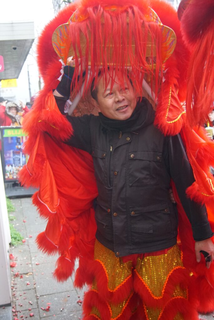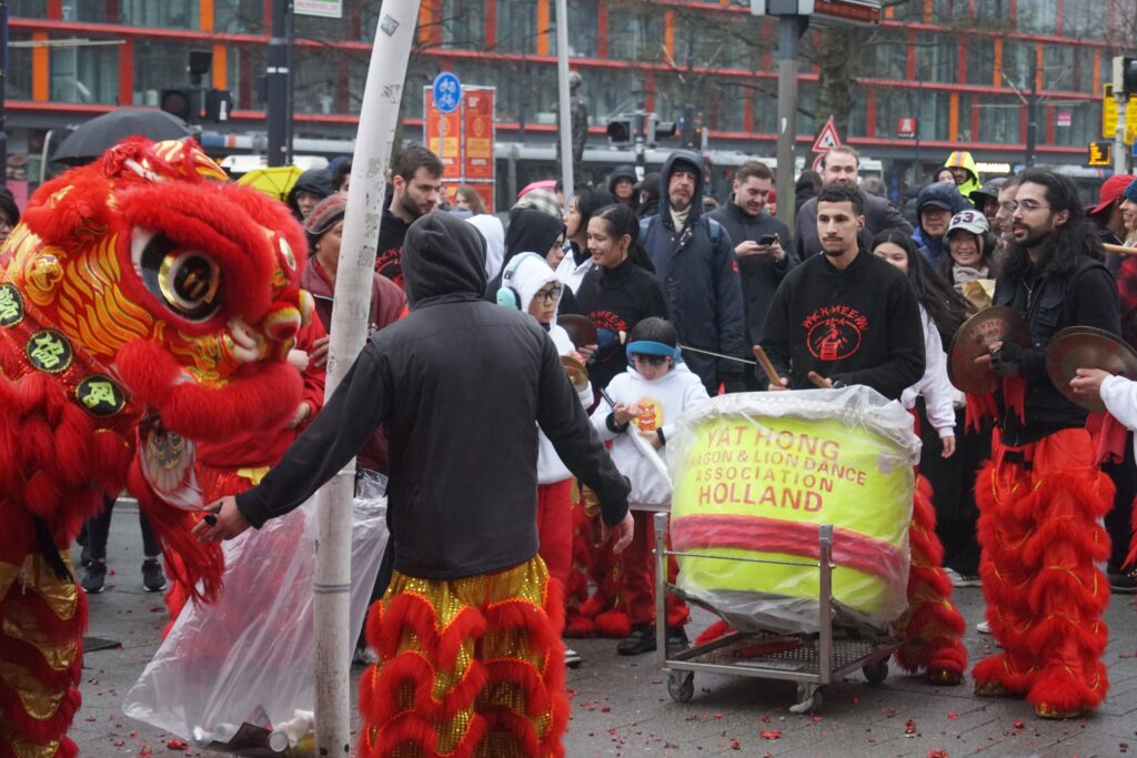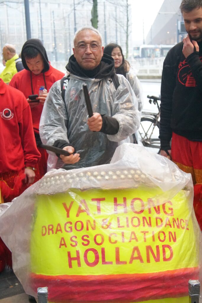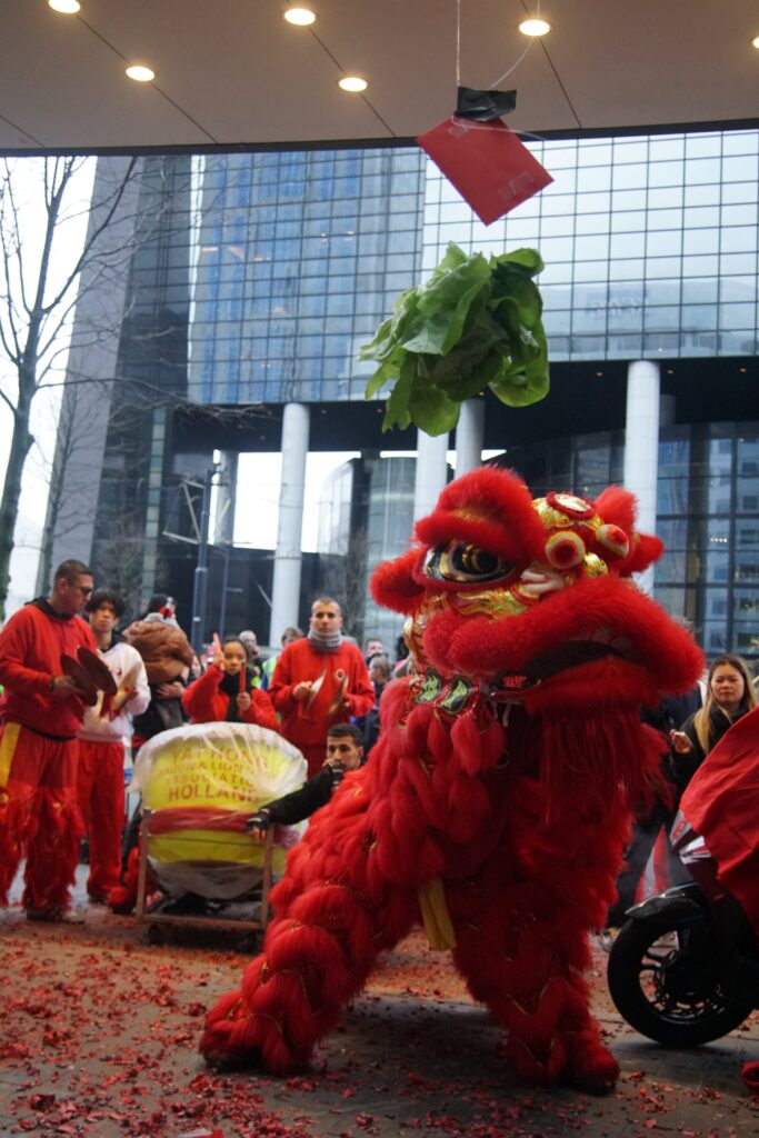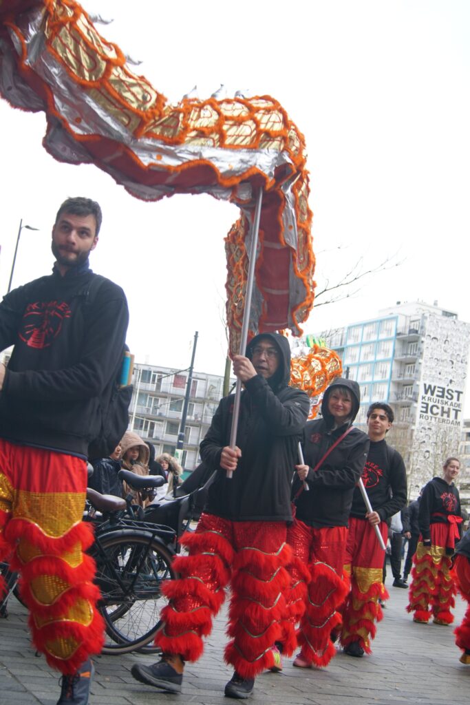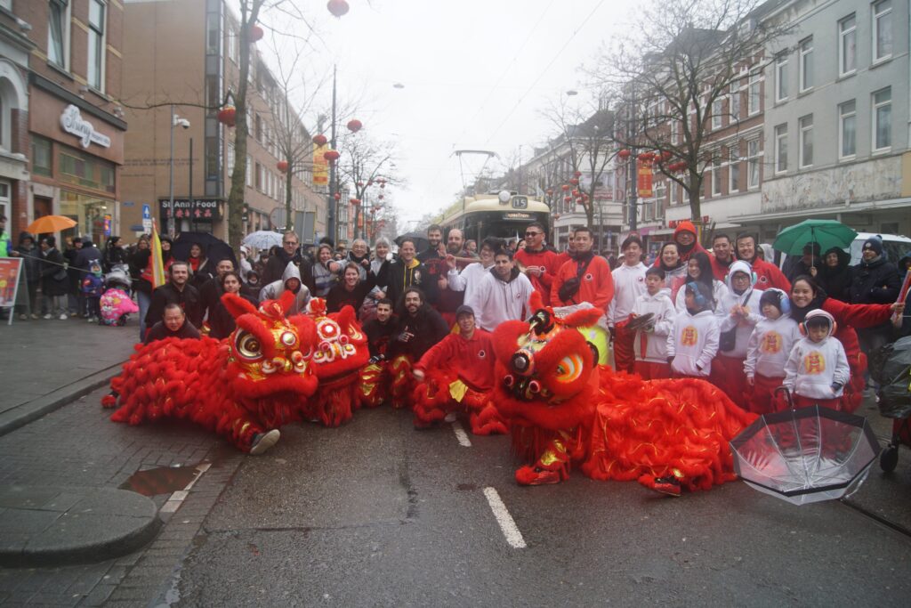 Saturday 28th of February, we joined (other Kung Fu schools’ names) to celebrate Chinese New Year in Rotterdam. An extra exhilarating celebration this year, since it was raining and our lion is made out of bamboo and paper. Fortunately the lion managed to brave the weather, enabling us to perform our duty to banish evil spirits through the use of fireworks, drums, loud percussion and of course, the lion dances. With the evil spirits gone, we’ve created space for good energy to come in. This is how the lion dance helps to bring in blessings for a healthy, fortunate and auspicious start to the new year.